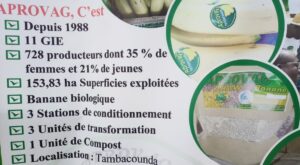 Monsieur Issa Mbengue, Président du Conseil d’Administration, a eu à faire l’historique de la filière Banane dans la Région de Tambacounda. Depuis sa Création en 1988, l’APROVAG s’est affirmée comme un Acteur clé du développement rural en mettant de nombreux Projets dans la filière Banane grâce aux Partenaires techniques et financiers. L’Association Compte 11 GIEs avec 728 Producteurs dont 36% de femmes et 21% de jeunes implantés dans les Communes de Missirah, Dialacoto et Netteboulou avec une Production annuelle de 3000 tonnes de banane écologique de haute qualité. Elle Contribue également au Renforcement de Capacités des Producteurs/ Productrices, à la Promotion de l’Agriculture biologique, à la mise en place de Solutions éco-responsables, à l’entrepreneuriat rural, à la promotion des droits humains et à l’autonomisation des femmes rurales dans les Zones d’intervention. Après de mures réflexions, l’Association tend vers une Coopérative.