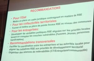 Pour les Recommandations, il est prévu de proposer à l’Etat de mettre un Cadre juridique contraignant en matière de RSE; de suggérer aux Collectivités territoriales de former et mettre en place de Points focaux RSE au niveau des Communes; de demander aux Entreprises de développer de véritables politiques RSE alignées sur les priorités locales tenant en compte les couches vulnérables (femmes, jeunes, personnes handicapées). Et d’une manière transversale, il va falloir faciliter la coordination entre les Entreprises et les autorités locales pour aligner les initiatives RSE aux priorités de développement territorial et d’organiser des Séances de redevabilité ( CT/ Entreprises/ Communautés).